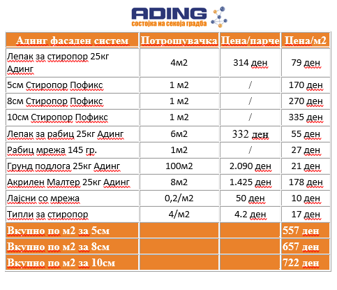 Ви ја имаме прикажано табелата за потрошувачка на материјалот со цени на оваа веб страна. Најдоле ги имате цените збирно на материјалот зависно до дебелината на стиропорот. Тоа е цената по м2 на материјалот. Додадете за работна рака и добивате приближно колку би ве чинела фасадата.